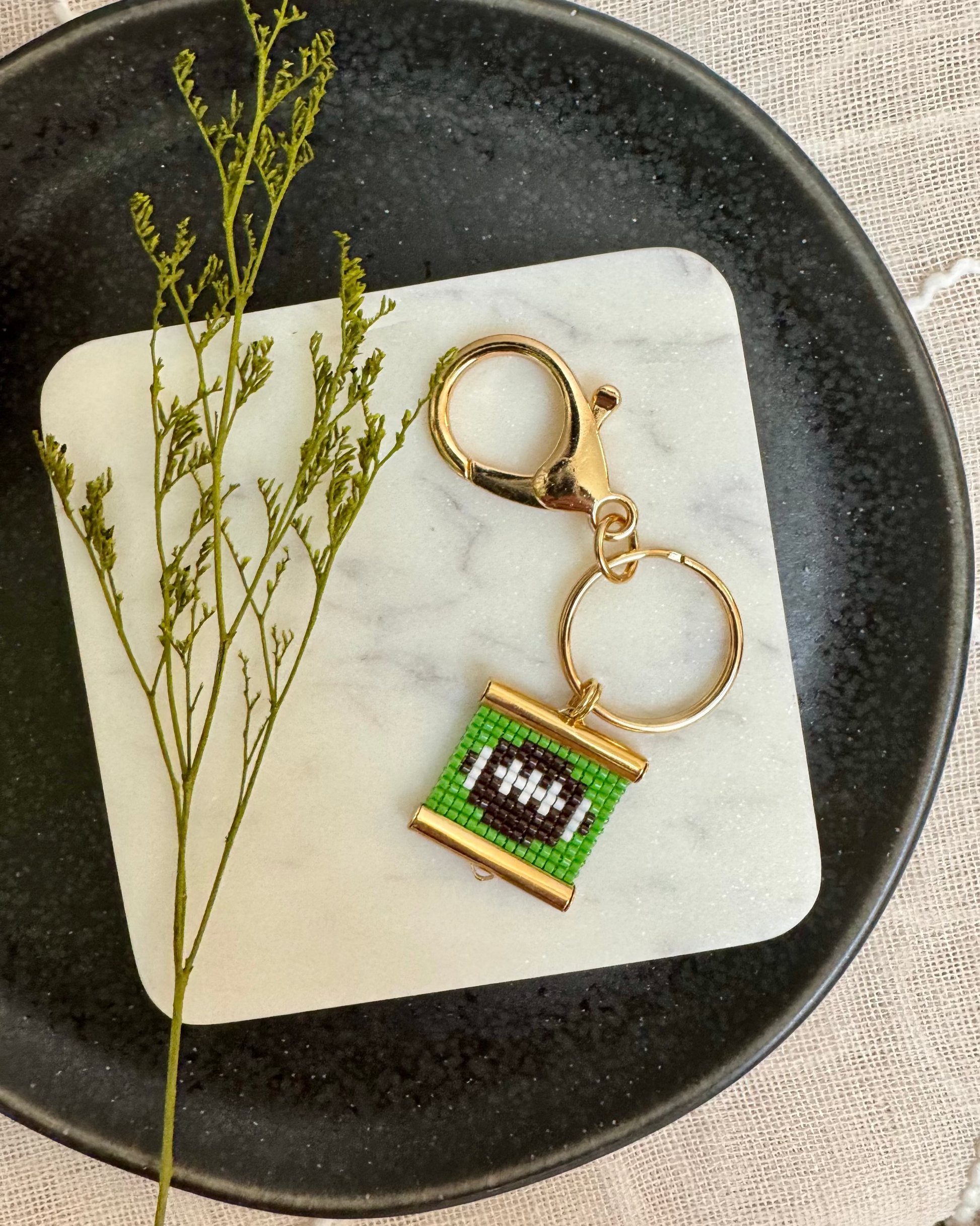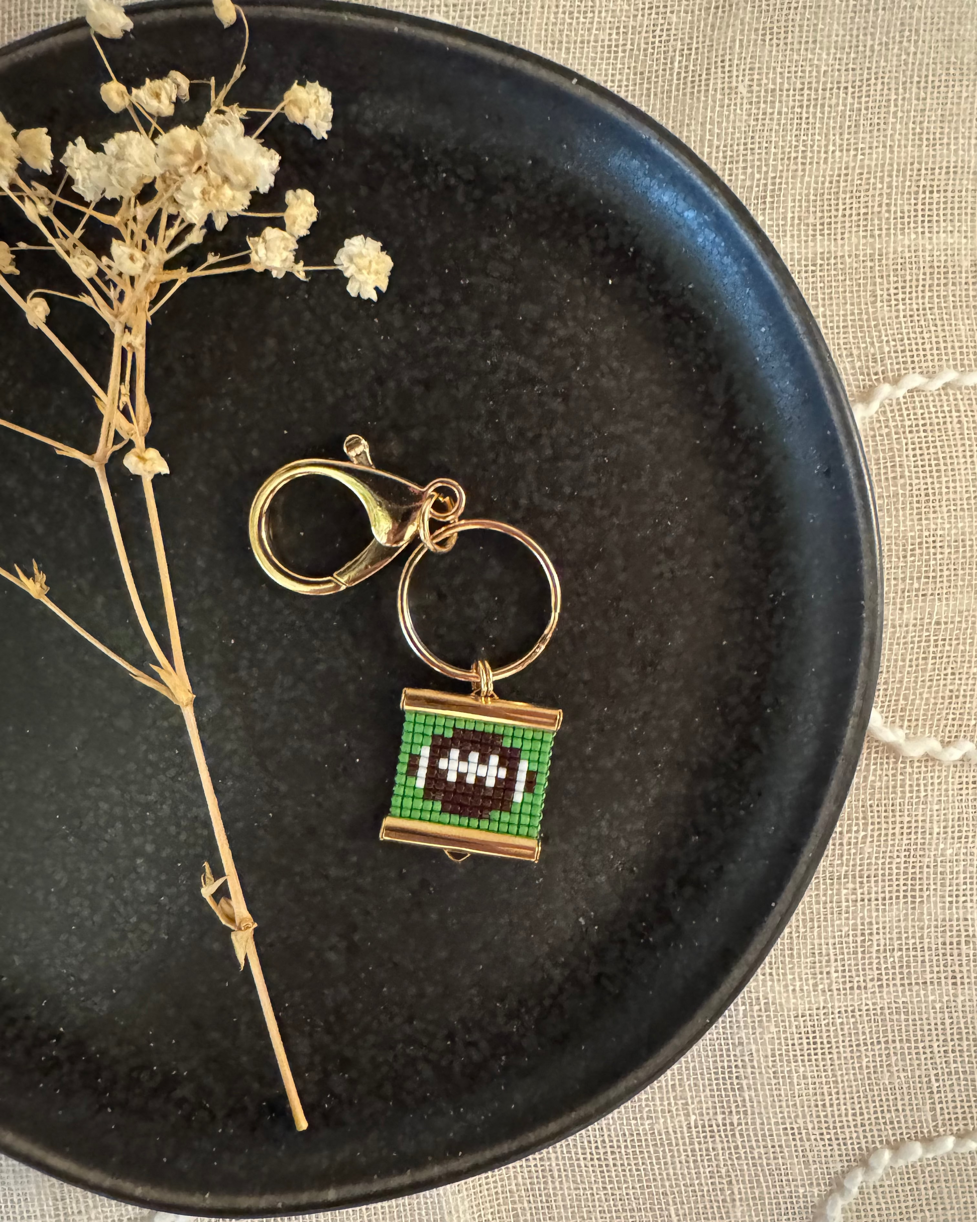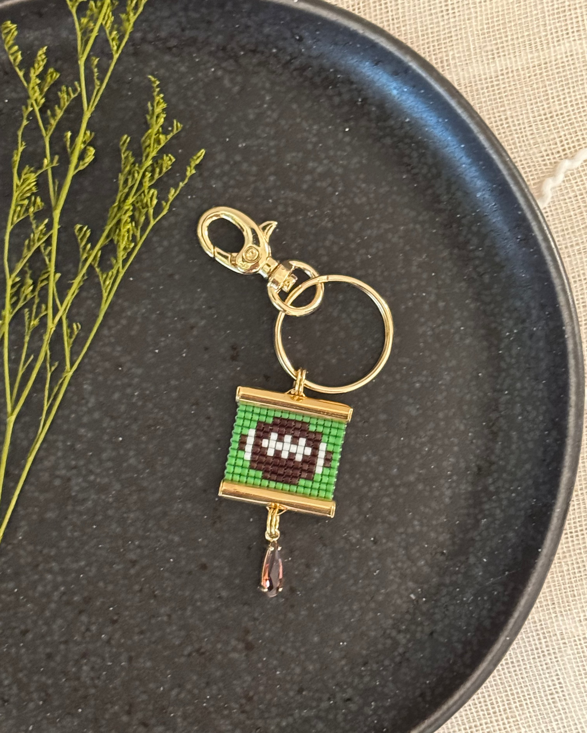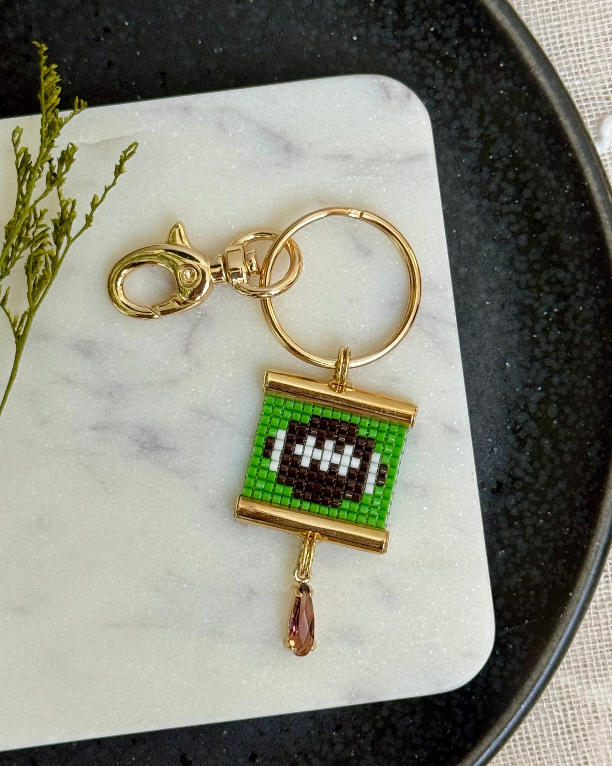 Remember to treat your bag charm with care - the beadwork is comprised of Miyuki Delica glass beads, which are durable enough for most scenarios but may fracture if exposed to sudden stresses or impacts.